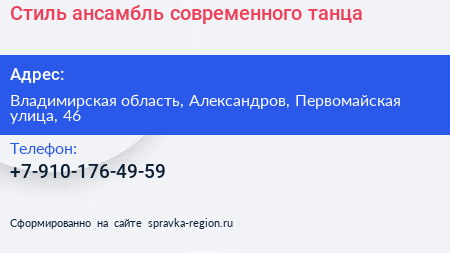 Стиль, ансамбль современного танца по адресу Владимирская область, Александров, Первомайская улица, 46 в дальнейшем Организация, размещена в следующих категориях: