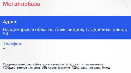 Металлобаза по адресу Владимирская область, Александров, Стадионная улица, 54 в дальнейшем Организация, размещена в следующих категориях: