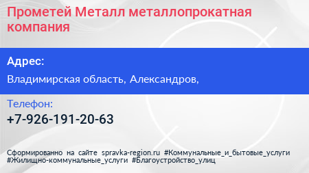 Прометей-Металл, металлопрокатная компания по адресу Владимирская область, Александров, в дальнейшем Организация, размещена в следующих категориях: