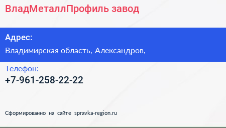 ВладМеталлПрофиль, завод по адресу Владимирская область, Александров, в дальнейшем Организация, размещена в следующих категориях: