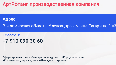 АртРотанг, производственная компания по адресу Владимирская область, Александров, улица Гагарина, 2 к3 в дальнейшем Организация, размещена в следующих категориях:
