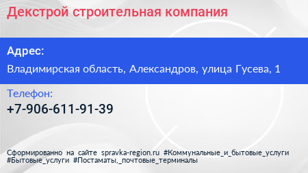 Декстрой, строительная компания по адресу Владимирская область, Александров, улица Гусева, 1 в дальнейшем Организация, размещена в следующих категориях:
