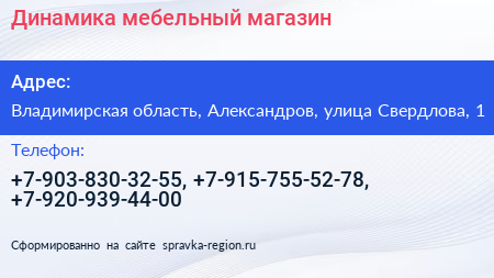 Динамика, мебельный магазин по адресу Владимирская область, Александров, улица Свердлова, 1 в дальнейшем Организация, размещена в следующих категориях: