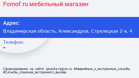 Fomof.ru, мебельный магазин по адресу Владимирская область, Александров, Стрелецкая 2-я, 4 в дальнейшем Организация, размещена в следующих категориях: