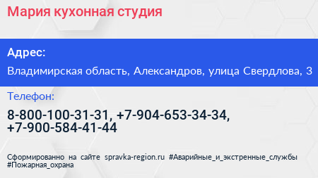 Мария, кухонная студия по адресу Владимирская область, Александров, улица Свердлова, 3 в дальнейшем Организация, размещена в следующих категориях: