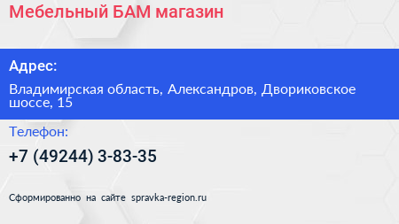 Мебельный БАМ, магазин по адресу Владимирская область, Александров, Двориковское шоссе, 15 в дальнейшем Организация, размещена в следующих категориях: