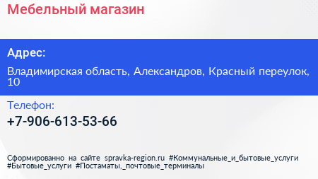 Мебельный магазин по адресу Владимирская область, Александров, Красный переулок, 10 в дальнейшем Организация, размещена в следующих категориях: