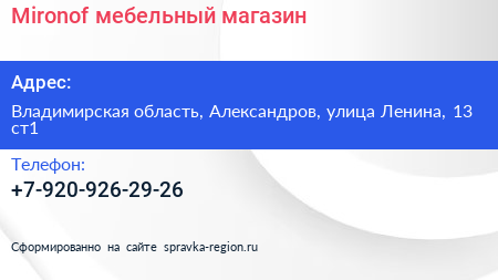 Mironof, мебельный магазин по адресу Владимирская область, Александров, улица Ленина, 13 ст1 в дальнейшем Организация, размещена в следующих категориях: