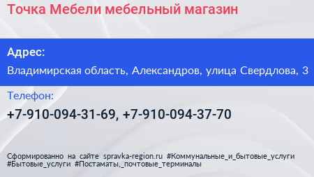 Точка Мебели, мебельный магазин по адресу Владимирская область, Александров, улица Свердлова, 3 в дальнейшем Организация, размещена в следующих категориях:
