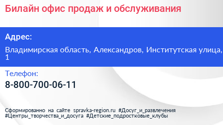Билайн, офис продаж и обслуживания по адресу Владимирская область, Александров, Институтская улица, 1 в дальнейшем Организация, размещена в следующих категориях: