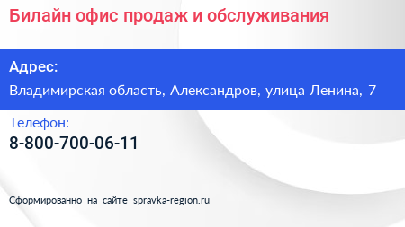 Билайн, офис продаж и обслуживания по адресу Владимирская область, Александров, улица Ленина, 7 в дальнейшем Организация, размещена в следующих категориях: