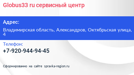 Globus33.ru, сервисный центр по адресу Владимирская область, Александров, Октябрьская улица, 4 в дальнейшем Организация, размещена в следующих категориях: