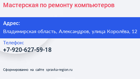 Мастерская по ремонту компьютеров по адресу Владимирская область, Александров, улица Королёва, 12 в дальнейшем Организация, размещена в следующих категориях: