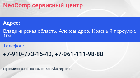 NeoComp, сервисный центр по адресу Владимирская область, Александров, Красный переулок, 10а в дальнейшем Организация, размещена в следующих категориях: