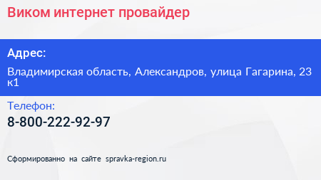 Виком, интернет-провайдер по адресу Владимирская область, Александров, улица Гагарина, 23 к1 в дальнейшем Организация, размещена в следующих категориях: