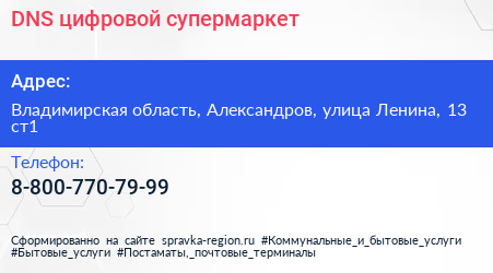 DNS, цифровой супермаркет по адресу Владимирская область, Александров, улица Ленина, 13 ст1 в дальнейшем Организация, размещена в следующих категориях: