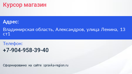 Курсор, магазин по адресу Владимирская область, Александров, улица Ленина, 13 ст1 в дальнейшем Организация, размещена в следующих категориях: