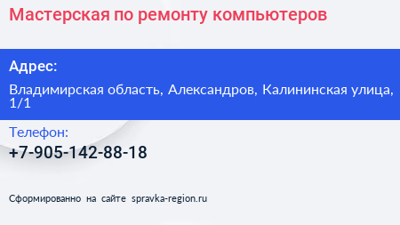 Мастерская по ремонту компьютеров по адресу Владимирская область, Александров, Калининская улица, 1/1 в дальнейшем Организация, размещена в следующих категориях: