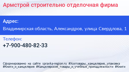 Армстрой, строительно-отделочная фирма по адресу Владимирская область, Александров, улица Свердлова, 1 в дальнейшем Организация, размещена в следующих категориях: