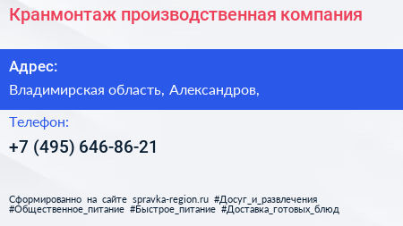 Кранмонтаж, производственная компания по адресу Владимирская область, Александров, в дальнейшем Организация, размещена в следующих категориях: