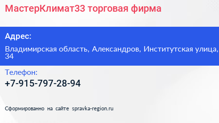 МастерКлимат33, торговая фирма по адресу Владимирская область, Александров, Институтская улица, 34 в дальнейшем Организация, размещена в следующих категориях: