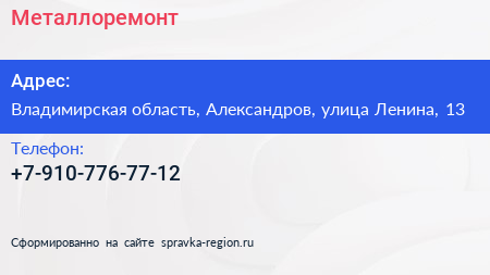 Металлоремонт по адресу Владимирская область, Александров, улица Ленина, 13 в дальнейшем Организация, размещена в следующих категориях: