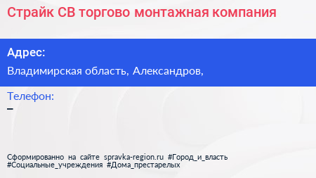 Страйк-СВ, торгово-монтажная компания по адресу Владимирская область, Александров, в дальнейшем Организация, размещена в следующих категориях: