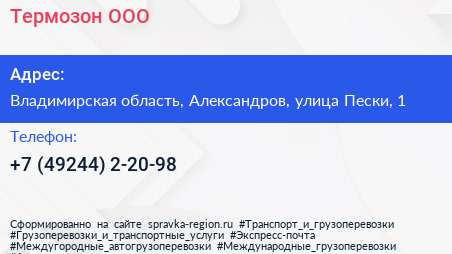Термозон, ООО по адресу Владимирская область, Александров, улица Пески, 1 в дальнейшем Организация, размещена в следующих категориях: