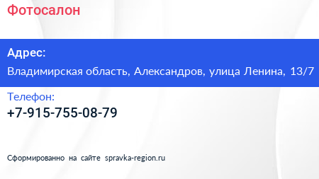 Фотосалон по адресу Владимирская область, Александров, улица Ленина, 13/7 в дальнейшем Организация, размещена в следующих категориях: