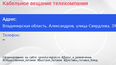 Кабельное вещание, телекомпания по адресу Владимирская область, Александров, улица Свердлова, 39 в дальнейшем Организация, размещена в следующих категориях: