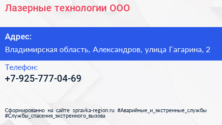 Лазерные технологии, ООО по адресу Владимирская область, Александров, улица Гагарина, 2 в дальнейшем Организация, размещена в следующих категориях: