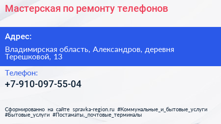 Мастерская по ремонту телефонов по адресу Владимирская область, Александров, деревня Терешковой, 13 в дальнейшем Организация, размещена в следующих категориях: