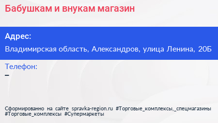 Бабушкам и внукам, магазин по адресу Владимирская область, Александров, улица Ленина, 20Б в дальнейшем Организация, размещена в следующих категориях: