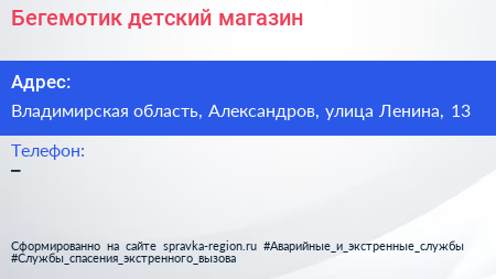 Бегемотик, детский магазин по адресу Владимирская область, Александров, улица Ленина, 13 в дальнейшем Организация, размещена в следующих категориях:
