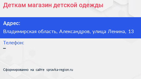 Деткам, магазин детской одежды по адресу Владимирская область, Александров, улица Ленина, 13 в дальнейшем Организация, размещена в следующих категориях: