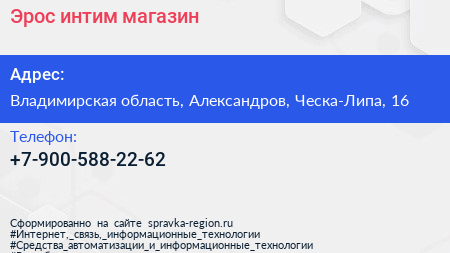 Эрос, интим-магазин по адресу Владимирская область, Александров, Ческа-Липа, 16 в дальнейшем Организация, размещена в следующих категориях: