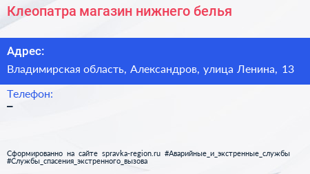 Клеопатра, магазин нижнего белья по адресу Владимирская область, Александров, улица Ленина, 13 в дальнейшем Организация, размещена в следующих категориях: