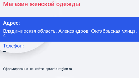 Магазин женской одежды по адресу Владимирская область, Александров, Октябрьская улица, 4 в дальнейшем Организация, размещена в следующих категориях: