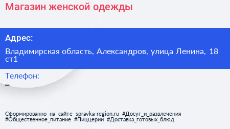 Магазин женской одежды по адресу Владимирская область, Александров, улица Ленина, 18 ст1 в дальнейшем Организация, размещена в следующих категориях: