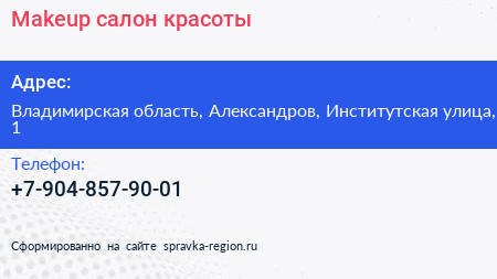 Makeup, салон красоты по адресу Владимирская область, Александров, Институтская улица, 1 в дальнейшем Организация, размещена в следующих категориях: