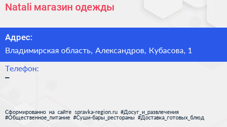 Natali, магазин одежды по адресу Владимирская область, Александров, Кубасова, 1 в дальнейшем Организация, размещена в следующих категориях: