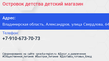 Островок детства, детский магазин по адресу Владимирская область, Александров, улица Свердлова, 64 в дальнейшем Организация, размещена в следующих категориях: