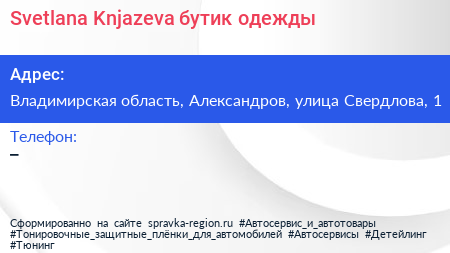 Svetlana Knjazeva, бутик одежды по адресу Владимирская область, Александров, улица Свердлова, 1 в дальнейшем Организация, размещена в следующих категориях: