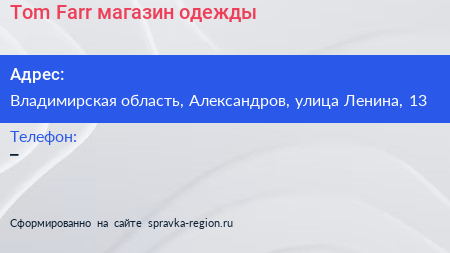 Tom Farr, магазин одежды по адресу Владимирская область, Александров, улица Ленина, 13 в дальнейшем Организация, размещена в следующих категориях: