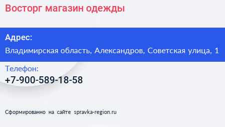 Восторг, магазин одежды по адресу Владимирская область, Александров, Советская улица, 1 в дальнейшем Организация, размещена в следующих категориях: