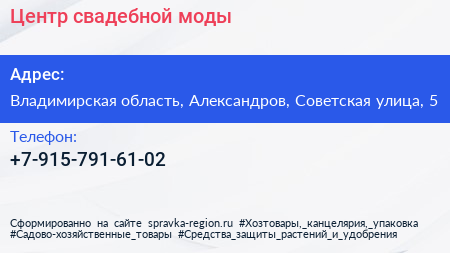 Центр свадебной моды по адресу Владимирская область, Александров, Советская улица, 5 в дальнейшем Организация, размещена в следующих категориях: