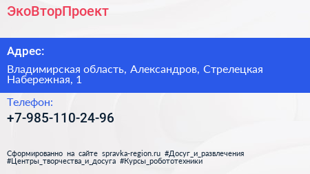 ЭкоВторПроект по адресу Владимирская область, Александров, Стрелецкая Набережная, 1 в дальнейшем Организация, размещена в следующих категориях: