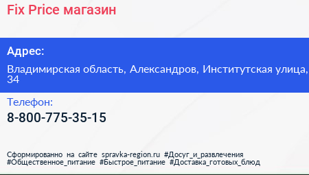 Fix Price, магазин по адресу Владимирская область, Александров, Институтская улица, 34 в дальнейшем Организация, размещена в следующих категориях: