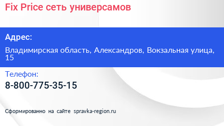 Fix Price, сеть универсамов по адресу Владимирская область, Александров, Вокзальная улица, 15 в дальнейшем Организация, размещена в следующих категориях: