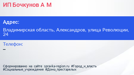 ИП Бочкунов А.М. по адресу Владимирская область, Александров, улица Революции, 24 в дальнейшем Организация, размещена в следующих категориях: